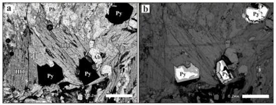Thin section of pyrite-bearing amphibole–mica schist. Ab—albite; Hbl—hornblende; Py—pyrite; Ph—phengite. Photomicrographs are obtained in transmitted plane polarized (a) and reflected (b) light. Mineral abbreviations are after [25].