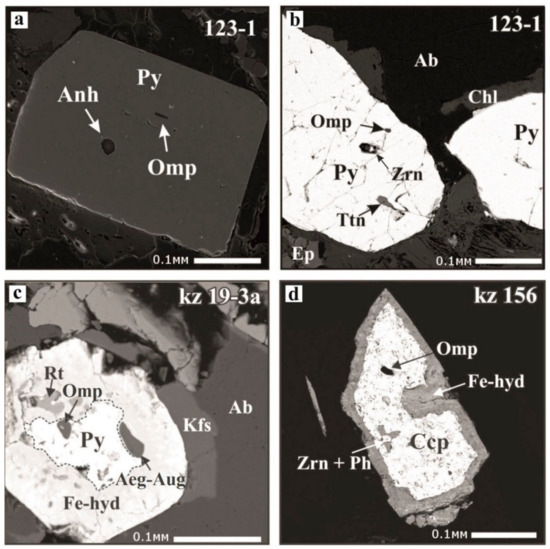Photomicrographs of pyrites and chalcopyrite of the Armovka Formation containing various mineral inclusions. (a) Secondary electron (SE) image. (b–d) Backscattered electron (BSE) images. Grey rims surrounding sulfides are replacements of pyrite and chalcopyrite by Fe hydroxides (Fe-hyd). The sample number is in the upper right corner. Ab—albite; Aeg−Aug—aegirine-augite; Anh—anhydrite; Ccp—chalcopyrite; Chl—chlorite; Fe-hyd—Fe hydroxides; Kfs—K-feldspar; Omp—omphacite; Ph—phengite; Py—pyrite; Rt—rutile; Ttn—titanite; Zrn—zircon.
