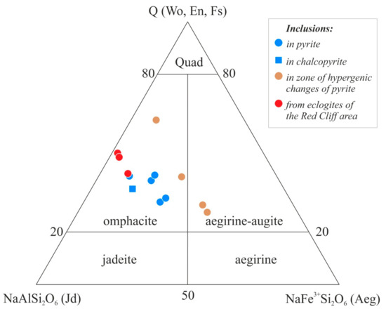 Pseudomorphic rims also contain mineral inclusions of amphibole, white mica, albite, and Na clinopyroxene of aegirine-augite composition (Na2O = 8.8–10, Al2O3 = 10.3–12.7 wt. %). All studied clinopyroxene inclusions were plotted on the Jd–Ae–Q diagram of Morimoto et al. [27] (Figure 6). All inclusions in pyrite or chalcopyrite are presented by omphacite, whereas aegirine-augite is found only in altered rims of sulfides. We assume that hypergenic changes lead to oxidation of Fe2+ to Fe3+, so, aegirine-augite is the result of omphacite alteration (Figure 4c).