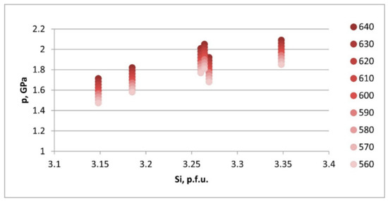 Pressure versus Si-content (per formula unit) calculated for every ten degrees for temperature range of 600 ± 40 °C using phengite barometer of [30].
