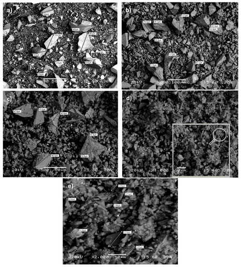 The particle morphology of the raw slag and the grinding products obtained after 30, 60, and 120 min of grinding, as derived with the use of SEM at different magnifications, is shown in Figure 1a–e.