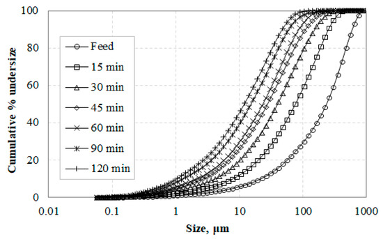 The particle size distributions of the feed (raw slag) and grinding products as a function of the grinding time are shown in Figure 2. It is seen that the particle size of the grinding product gradually decreases with the increase of grinding time. It is known that the degree to which finer particles are reduced depends on the mill, the material type, and the grinding conditions [58]. Figure 2 also shows that no particle agglomeration was observed even after 120 min of grinding, unlike the findings of previous studies which indicate potential agglomeration after long grinding periods [59,60]; the absence of agglomeration is due to the lack of clay minerals in the feed and is confirmed in Figure 1d which shows that particles are distinct.