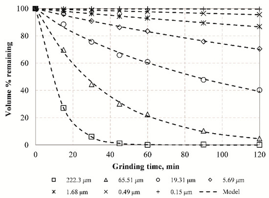 In order to investigate the grinding kinetics of the raw slag seven representative sizes (222.3, 65.51, 19.31, 5.69, 1.68, 0.49, and 0.15 μm) were selected, and the remaining volume (%) fraction for each size after various grinding times was determined, as seen in Figure 3. The results indicate that the remaining fraction of each representative size decreases with increasing grinding time and the experimental data can be expressed by Equation (2), which confirms that grinding of slag exhibits non-first-order behavior and the reduction rate of each size is time dependent. The deviation from the first order is more evident for the larger particle sizes which are ground more efficiently than finer particles during grinding. The non-first-order grinding behavior is due to either mill conditions or material properties and has been reported in several earlier studies [22,34,61,62].