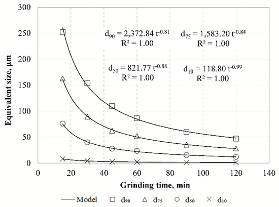 In order to investigate the grinding behavior of raw slag, non-linear regression analysis was carried out to correlate the equivalent particle size and grinding time (Figure 4).