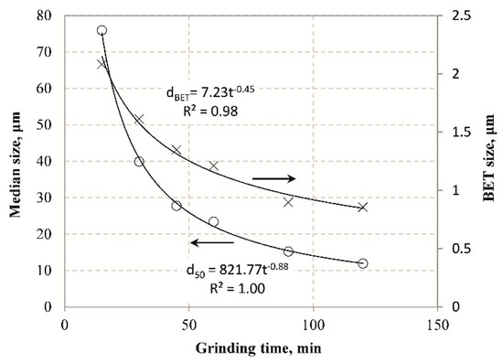 In this equation the SSA values of BET provided in Table 4 were considered and the BET size at each grinding time was determined by using the relation f/k = π/6. The results of Figure 5 show that in both cases the product particle size decreases with the grinding time, and very strong correlation between them is obtained with the use of inverse exponential function. However, the use of BET results in much finer particle sizes in comparison with LD. The results obtained from BET allow the determination of the true grinding limit as already mentioned in previous studies [63].
