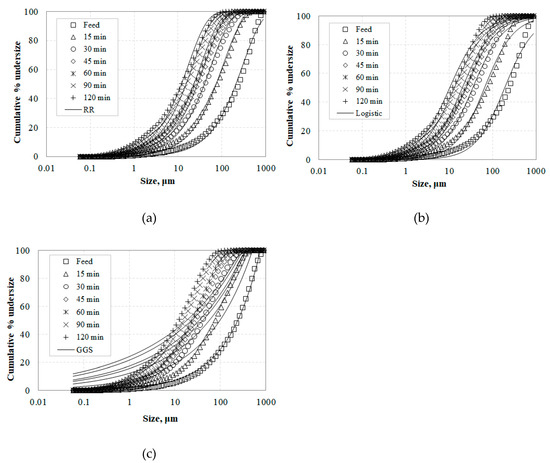 Particle size distribution of slag grinding products using the (a) Rosin–Rammler (RR) and (b) Logistic model, and (c) Gates–Gaudin–Schuhmann (GGS) distributions.