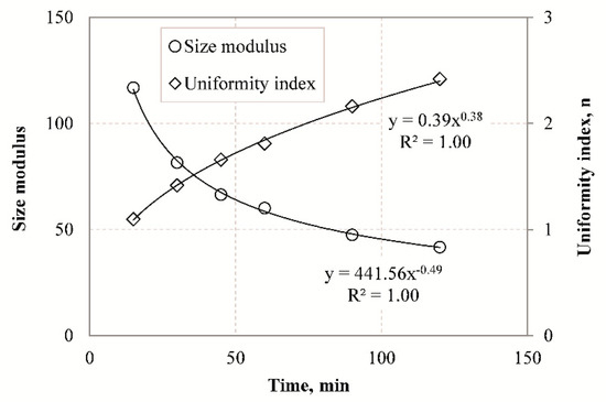 Size parameters such as size modulus and uniformity index were also determined with the use of the RR model to characterize particle size distribution of the slag grinding products. As shown in Figure 7, the size modulus decreases with increasing grinding time, while the uniformity index becomes higher as grinding proceeds. These results indicate that the finer the product size the higher is the n value, and the PSD becomes narrower. Very strong correlations (R2 = 1.00) are obtained with the use of exponential functions between size modulus or uniformity index and grinding time.