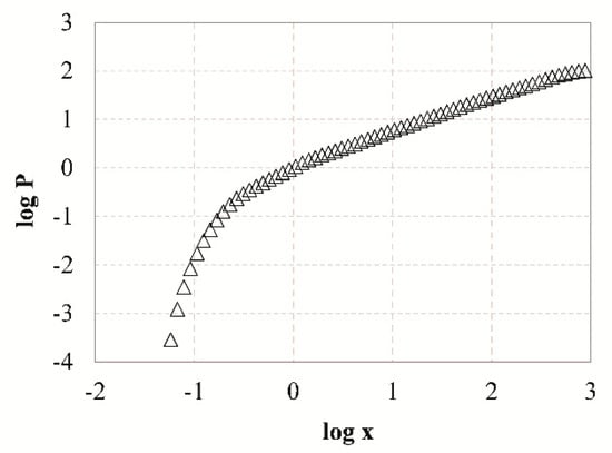 Equation (4) indicates that if the data follow the RR distribution, the plot of loglog(100/(100-P)) versus logx will be a straight line from which n and x’ can be calculated.
