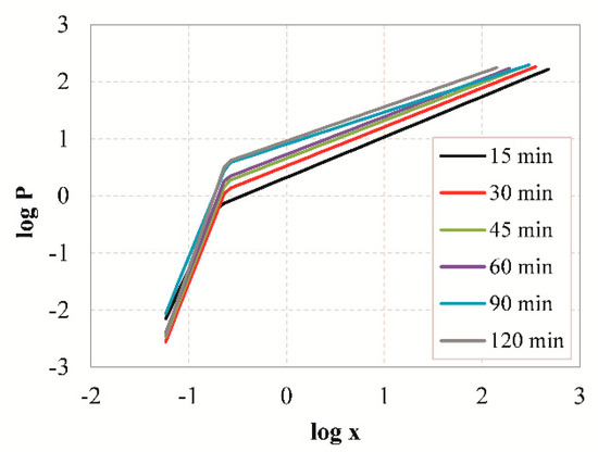 Since simple linear models may not fit the entire dataset, a piecewise approximation could be used for the description of the PSD of the grinding products [48,49]. Based on this, it is assumed that there could be two intervals of particle sizes separated by a critical size. This could mean that the log-transformed data of Equation (7) would yield two straight lines, separated by a breakpoint (logxb) defined as the transition point between two particle intervals,