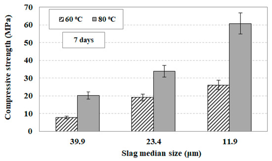 In order to investigate the effect of slag particle size on the compressive strength of the produced AAMs, three different median sizes of slag particles were selected, namely 39.9, 23.4, and 11.9 μm, obtained after 30, 60, and 120 min of grinding, respectively. The equivalent particle sizes of slag products are presented in Table 4. The other AAM synthesis conditions were the H2O/Νa2O molar ratio in the paste of 12.9, the curing period of 24 h and the ageing period of seven days. The setting time of the paste depends on the particle size of the slag product and ranges between 3 and 9 h for the different grinding products tested. It was observed that the paste consisting of finer particles requires much shorter setting time compared to the paste consisting of coarser particles. This is due to the fact that the finer particles have larger specific surface area and react faster with the activating solution [68]. Figure 10 shows the compressive strength of the AAMs produced as a function of particle size and curing temperature (60 or 80 °C).
