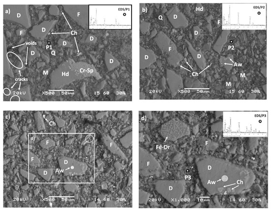 SEM-back-scattered electron (BSE) images of cross-sections of AAMs produced using slag particles with median size of (a) 39.9 μm, (b) 23.4 μm, and (c,d) 11.9 μm. The presence of unreacted compounds, crack propagation and void formation is seen in several spot locations. Q: Quartz (SiO2), D: Diopside (CaMgSi2O6), M: Magnetite (Fe3O4), F: Fayalite (Fe2SiO4), Hd: Hedenbergite (Ca(Fe,Mg)(SiO3)2), Cr-Sp: Cr-Spinel, Fe-Dr: Ferrite dendrites, Ch: Chromite (FeCr2O4), Aw: Awaruite (Ni3Fe).