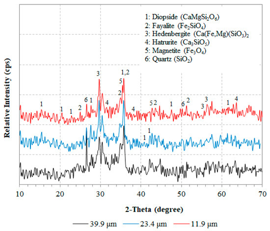 The AAMs produced using the same synthesis conditions were also characterized with XRD, as seen in Figure 12. The results indicate that the mineralogy of the AAMs produced using different slag median size have no significant differences. The specimens show a typical amorphous (broad hump between 20° and 40° 2θ) to semi-crystalline composition consisting of several crystalline phases, i.e., quartz (SiO2), hedenbergite (Ca(Fe,Mg)(SiO3)2), fayalite (Fe2SiO4), diopside (CaMgSi2O6), magnetite (Fe3O4), and hatrurite (Ca3SiO5).