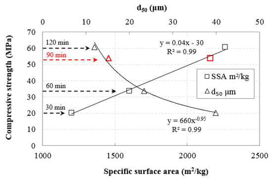 Figure 13 shows the effect of d50 slag particle size and BET specific surface area (SSA) on the compressive strength (CS) of the AAMs produced under the conditions H2O/Νa2O molar ratio 12.9, heating 80 °C, curing period 24 h, and ageing period seven days. Three different median sizes of slag were used, namely 39.9, 23.4 and 11.9 μm corresponding to raw material obtained after 30, 60, and 120 min of grinding, respectively. Table 4 shows the respective values of SSA of the slag grinding products. Simple regression analysis with the use of Excel software was carried out to establish potential correlations between CS and d50, SSA and equations with the highest correlation coefficient R2 were obtained. As seen in Figure 13, very strong correlation between CS and d50 is obtained using inverse exponential equation, while CS is correlated very well with SSA using linear equations. The experimental data were validated with the execution of additional experiments using as raw material slag with a median size 15.2 μm (90 min of slag grinding), and the results are given in Figure 13. The obtained equations are the following