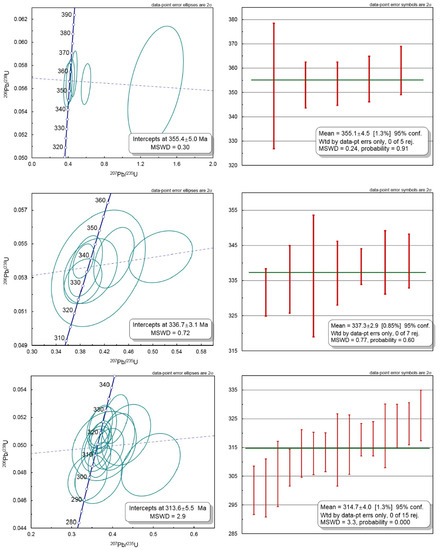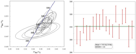 Concordia and weighted mean diagrams for U–Pb ages of zircon grains in vein H10-3. Error ellipses are shown at 1 σ. Weighted mean at 2 σ.