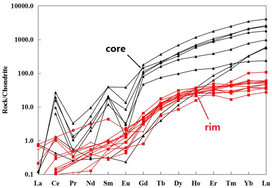 Chondrite-normalized rare earth element (REE) patterns for zircons in eclogite sample H11-5. Chondrite-normalization values were taken from [70].