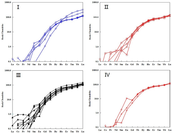 Chondrite-normalized REE patterns for zircons in vein sample H10-3. (I)–(IV) are denoted to Group I to Group IV zircon, respectively. Chondrite-normalization values were taken from [70].