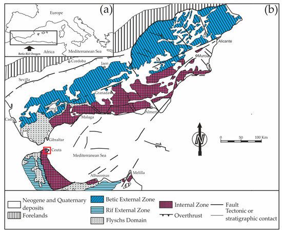 Geological map of the Betic-Rif Cordillera: (a) location of the orogen in the Mediterranean Sea; (b) distribution of the Internal and External Zones, Flyschs and Neogene basins of the Betic-Rif Cordillera, and location of the study area (red square) (modified from Sanz de Galdeano [38]).