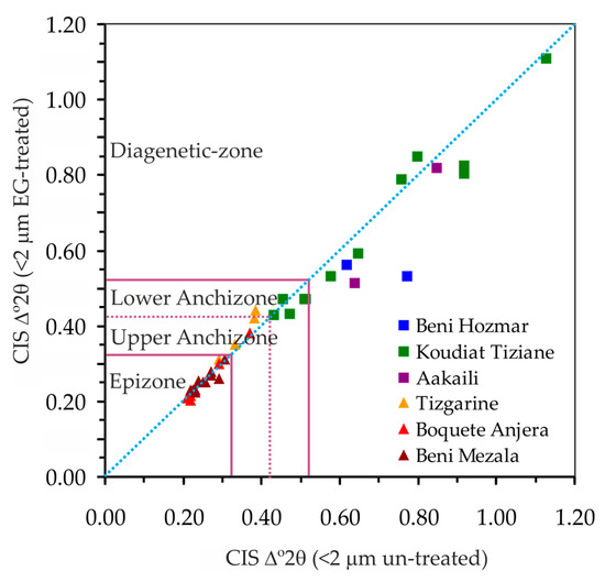 The CIS values for both sandstones and metapelites reveal an increase in metamorphic grade from typical diagenetic-low grade anchizone values (1.50–0.37 Δ°2θ, Table 1) in the Ghomaride complex to upper anchizone (Tizgarine)-epizone (Boquete Anjera and Beni Mezala) conditions (0.43–0.21 Δ°2θ, Table 2) in the Federico units according to the revised anchizone boundaries of the CIS scale (from 0.52 to 0.32 Δ°2θ) [50]. The significant variation in values for different samples in the Ghomaride complex is typical of the diagenesis [51]. In addition, most of the Ghomaride complex samples have CIS values larger than those of the EG-treated samples (Figure 5), probably implying the presence of smectite layers interstratified with diagenetic illite.