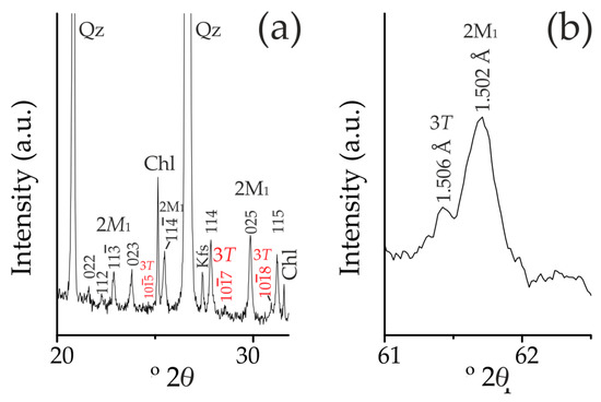 An average of 9.004 Å (σ = 0.008) was obtained for the b cell parameter of dioctahedral micas in the ghomaride samples (Table 1), whereas the average for the Federico units was 9.010 Å (σ = 0.012). If considering only samples where 2M1 polytype and 3T polytype (indicative of high-pressure conditions, HP; [52,53,54]) coexist (Figure 6), the average b parameter increases softly up 9.017 Å (σ = 0.006). Nevertheless, the average corresponding to the Federico samples with only the 2M1 polytype is 9.005 Å (σ = 0.013).