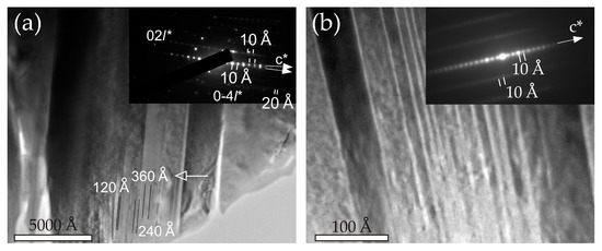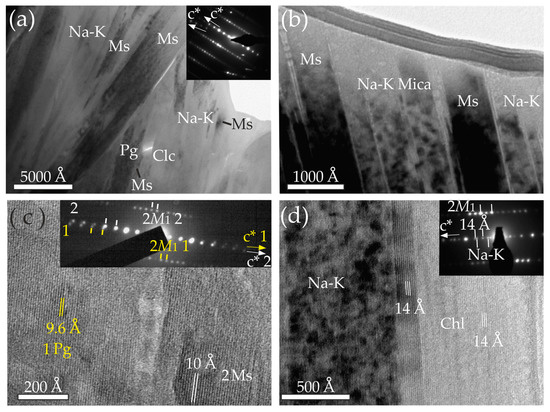 In relation to the Federico units’ samples, epizonal metapelite MG-21 includes muscovite, Na-K intermediate mica, and a minor presence of paragonite and chlorite. The most evident features of this sample at the nanometer scale is the thickness of the phyllosilicate packets, in most of the images >500 Å, and the variety of orientations from parallel to well-defined high-angle grain boundaries (Figure 9a). Grain sizes of dioctahedral micas with different interlaminar composition are approximately equal (Figure 9b), suggesting their formation under the same conditions. In addition to the presence of Na-K micas, muscovite and paragonite, both 2M1, coexist as separate crystals (Figure 9c). Chlorite packets are clinochlore (Mg/(Mg + Fe) = 0.84), with a few thousands of amstrongs thick and SAED patterns with sharp reflections consistent with large, defect-free crystals (Figure 9d).
