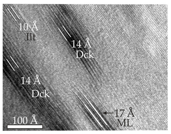 Lattice-fringe image showing the coexistence of illite, dickite, and mixed layers (ML) at the nanometer scale (sandstone MG-56, Ghomaride; modified from Ruiz Cruz et al. [3]).