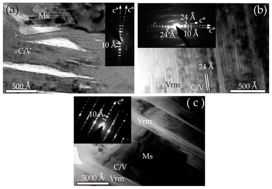 Nanometer scale view of the “dark” bands distinguished by petrographic microscopy in the MG-18 schist (Federico units): (a) phyllosilicate packets (10 Å periodicity, see SAED) with lenticular voids; (b) lattice-fringe image and SAED showing 24 Å periodicity, which corresponds to chlorite/vermiculite mixed-layers; and (c) thick crystals of muscovite and vermiculite (>1000 Å). C/V: mixed-layers chlorite/vermiculite.
