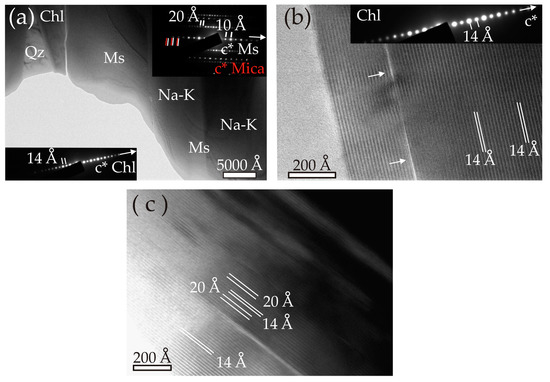 Deep diagenetic lutite MG-44 is mainly composed of illite and chlorite. The low-magnification images show illite packets with both parallel and contact-angle boundaries. The thickness of the packets ranges between tens and a few hundreds of amstrongs, typical of diagenetic clays. 2M1 and 1M polytypes were identified on the basis of selected area electron diffraction patterns (SAED); this observation is in accord with the periodicities of the lattice fringes, showing 10 Å and 20 Å periodicities (Figure 7a). In some cases, lattice fringe images reveal contrast differences, suggesting the presence of smectite interlayers (light contrast, Figure 7b), which is in coherence with the observations made in Figure 5 with respect to the variations in the CIS values between the <2 µm vs. <2 µm EG-treated fractions. In addition, AEM analyses of these areas have relatively high Si and low K contents, confirming the mixed layering.