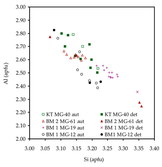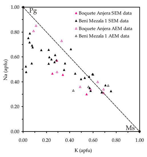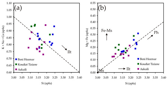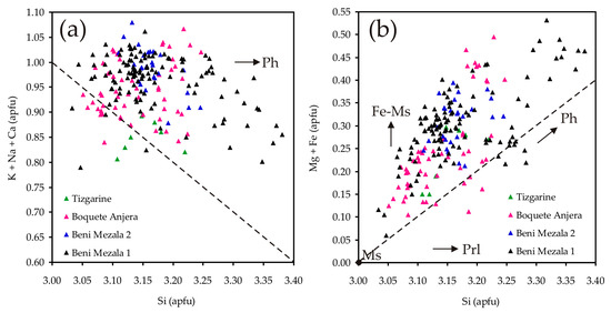 The average structural formulae of K-rich dioctahedral micas of authigenic origin, corresponding to samples from different units, are presented in Table 4. Authigenic micas corresponding to the ghomaride sandstones display deficiencies in interlayer cations, with this observation being consistent with the presence of illite/smectite mixed layers described above (Figure 5 and Figure 7b) and the excess of Si, mainly caused by both illitic (Figure 12a) and phengitic components (Figure 12b). In addition, Na contents are significant in some of the analyzed illites (up to 0.32 apfu in the Aakaili analyses). In the Federico units, K-dioctahedral micas corresponding to the Tizgarine unit (MG-34) are more homogeneous but also with a clear illitic substitution (Figure 13). Nevertheless, Boquete Anjera and Beni Mezala analyses, in spite of the heterogeneity, are close to true muscovite, with interlayer cation sums close to 1 apfu in most cases (Figure 13a). This is in accord with the epizonal grade of these samples, where, according to Abad et al. [56], the illitic component becomes insignificant. In any case, in micas from Federico units, the proportions of Si, Al, and Fe + Mg are mostly controlled by the phengitic and the ferrimuscovitic vectors (Figure 13b). However, the white micas with the highest Si and Fe + Mg contents show high Mg values and deficits in the interlaminar content (white micas in the whitish schist); this trend could represent contamination by trioctahedral phases (Figure 10a,c).
