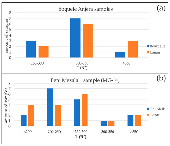 Semi-empirical thermometry was applied in samples studied by electron microscopy after a selection of the analyses according to the criteria related to the Si content and the value of octahedral vacancies given by Bourdelle et al. [15] and Lanari et al. [16]. Finally, only analyses from four samples of the Federico units (two from Boquete Anjera unit, one from Beni Mezala 2 unit, and one from Beni Mezala 1 unit) were valid for the calculations. The Lanari geothermometry calculations were done considering a P from 1 to 3 kbar in function of the crystal-chemical parameters determined in the micas of the selected samples. As the values obtained from the different pressures are very similar, the data presented here correspond to the average pressure (2 kbar). The average temperature of each sample with the standard deviation (SD) are listed in Table 9, except for sample MG-62, that gives significant differences between the two values obtained (387 and 245 °C according to Bourdelle et al. [15] thermometer and 508 and 254 °C, respectively, with the Lanari et al. [16] thermometer). The temperature estimations of the studied rocks with both the Bourdelle et al. [15] and Lanari et al. [16] approaches are rather similar (Figure 16). Temperatures range between 250 and 400 °C in samples from the Boquete Anjera unit and between 150 and 350 °C in Beni Mezala 1 unit. In any case, the predominant values are higher than 300 °C (Figure 16), which is in coherence with the CIS values of epizone obtained for these units (Figure 5).