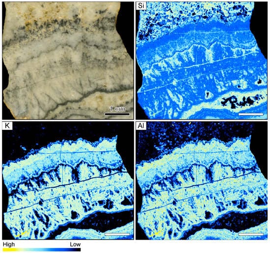 Sample image and corresponding element maps of a banded quartz vein sample from the Hokuryu low-sulfidation epithermal deposit in Japan. The element maps were obtained by micro-X-ray fluorescence (µXRF) measurements. The sample is primarily composed of quartz, as demonstrated by the high Si count rates. Only two continuous bands in the specimen show elevated K and Al count rates, which may be related to the occurrence of adularia. The scale bar is 1 cm.