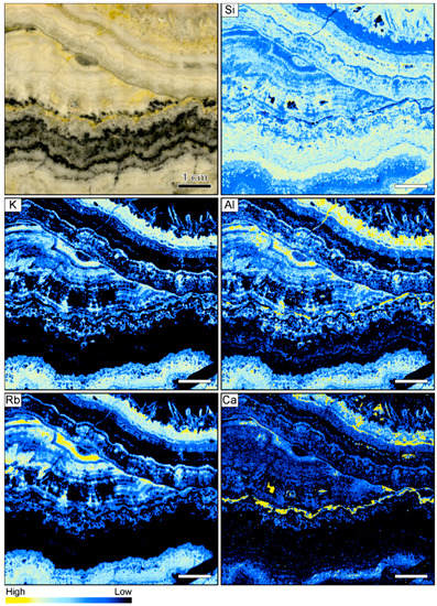 Sample image and corresponding element maps of a banded quartz vein sample from the Sado Kinzan low-sulfidation epithermal deposit in Japan. The element maps were obtained by µXRF measurements. The element distribution maps highlight that many of the bands contain high K, Al, and Rb count rates, suggesting the occurrence of adularia. In addition, some bands are characterized by high Ca and lower Si and Al count rates, suggesting the presence of carbonate minerals. The scale bar is 1 cm.