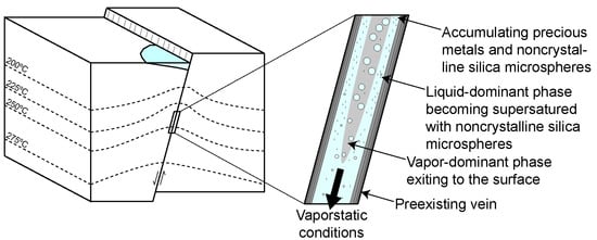 It is envisaged here that the microspherical silica in the ginguro and gankin bands record events of vigorous boiling or flashing within the vein. During each event of vigorous boiling or flashing, the location of the vaporstatic conditions propagates towards depth, and repeated events reach towards different depths in the vein. During vigorous boiling or flashing, the silica is deposited from the residual liquid within the two-phase flow. Metal precipitation may have occurred together with silica deposition. This is especially true for ore mineral grains present in the so-called sluice-box textures in which ore minerals intermixed with silica were deposited around protrusions of the vein walls forming a thin layer over the tops of the protrusion and a thick deposit on the leeward side [14,39,40,41]. This texture has not been observed in the limited number of samples investigated in this study. However, many of the ore mineral grains in the samples studied appear to have grown within the bands of microspherical silica, presumably as the matrix was gel-like and yielding. In contrast, the large aggregates of composite ore minerals appear to have grown into open spaces between silica microspheres, as suggested by the presence of euhedral quartz overgrowths separating the ore minerals from the microspherical matrix. Metal deposition within the silica bands likely also occurred from the liquid under conditions of two-phase flow, with much of the vapor streaming occurring in the center of the open vein potentially forming an annular flow (Figure 10). Metal supersaturation in the liquid flowing through the pore space between the silica microspheres may have been achieved by vapor loss from the liquid. Different ore minerals were formed at different times and locations depending on the temperature of the residual liquid and the degree of vaporization. Continued recharge of buoyant liquid from depth ensures continuous metal supply allowing deposition of comparably large amounts of metals within the ginguro and gankin bands.