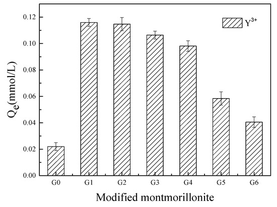 In order to select the suitable modifier to prepare the Mt with an excellent adsorption capacity to RE, different modifiers were applied to the modification of Mt and the modified Mt was prepared for adsorption of Y3+. The results are shown in Figure 1. As illustrated in Figure 1, the adsorption capacity of Y3+ on Mt was higher than raw Mt (G0). The modification of Mt by organic surfactant mainly had two functions: (1) the Mt surface changed from hydrophilic to hydrophobic, and showed a better swelling property. At the same time, the interface polarity and chemical microenvironment of Mt was improved to form adsorbents with excellent adsorption properties on organic macromolecules or groups [34]; (2) Organic macromolecules with long carbon chains entered the Mt interlayer and interlaminar organic molecules were arranged in multiple molecular layers, expanding the interlayer structure of Mt thus allowing greater ion-exchange to occur [35,36]. Thus, its adsorption capacity to rare earth ions increased to a certain extent. Among them, the composite of HDTMA and DDTC presented a greater modification than single HDTMA. However, the adsorption capacity of Y3+ on acid-modified Mt was higher than that of organo-Mt. That may be explained by the ion-exchange of Na+, K+, Al3+ (octahedral cations) by H+, which has lower atomic radius and the interlayer ions are converted into soluble salts and dissolved. This acid modifying process would significantly increase the basal spacing and specific surface area of Mt, along with the elimination of several mineral impurities and partial dissolution of the external layers, which improves its adsorption capacity [37]. Since modification by the composite acid of HCl and H2SO4 only showed a little difference from that of single HCl and H2SO4. In industrial applications, HCl shows a volatile properties and difficult transportation. Thus, H2SO4 was chosen as a modifier in this study.
