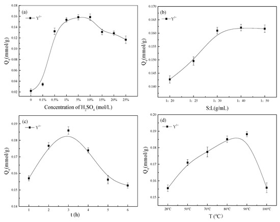 Effects of (a) H2SO4 concentration; (b) solid:liquid ratio; (c) modification time; (d) modification temperature on adsorption of Y3+.
