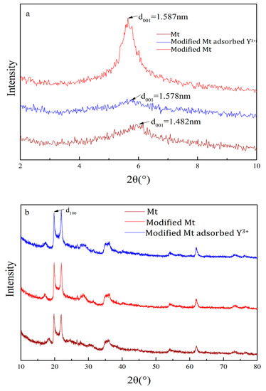 The results of XRD patterns of Mt, modified Mt and modified Mt adsorbed Y3+ were summarized in Figure 3, where (001) crystal surface belonged to the characteristic peak of Mt. The crystallographic spacing (d) of Mt is calculated by the Bragg’s equation.