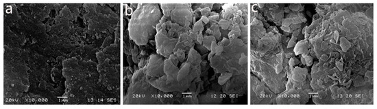 The morphologies of Mt, modified Mt, modified Mt adsorbed Y3+ are shown in Figure 5. The typical characteristic morphology of Mt showed a schistose structure and contains pores, which provides channels and higher surface area for RE ions adsorption in Figure 5a. In aqueous medium, the Y3+ were easily adsorbed as the water permeation on account of the layered, folded and richly wrinkled morphology of Mt [43]. However, the introduction of H2SO4 in Figure 5b led to the irregular schistose structure of modified Mt with numerous cavities, which was convenient for Y3+ adsorption into the pore spaces and resulted in an increase in the adsorption capacity of Y3+. That accounts for that the acidification process makes the structure fluffy. This is in accordance with the results indicated by the XRD pattern. The modified Mt adsorbed Y3+ in Figure 5c shows no significant difference compared with the modified Mt.