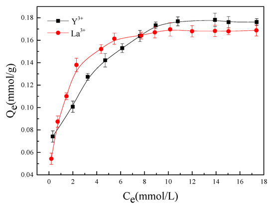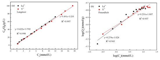 Modified Mt (0.5 g) was mixed with 25 mL RE solution with different concentrations and filtrated after shaking for 14 h. The RE concentration of filtrate was measured and the equilibrium adsorption capacity was calculated. Adsorption isotherms are important for describing how molecules or ions interact with adsorbent surface sites. The Langmuir isotherm model and the Freundlich isotherm model were applied to fit the adsorption data and they are expressed by the following Equations (2) and (3) [30,31].