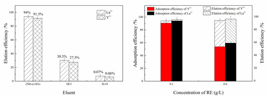 In order to prove that modified Mt could be used to recycle RE effectively, the elution experiment was also investigated shown in Figure 8. Elution experiments were carried out under the condition of adsorption equilibrium concentration of RE ions, where La3+ and Y3+ were 12.277 mmol/L and 15.943 mmol/L, respectively. It is indicated that (NH4)2SO4 elution efficiencies of La3+ and Y3+, 94.0%, 91.5% were higher than that of HCl (30.3%, 27.5%) and distilled water (0.06%, 0.08%). The results confirm RE ions adsorbed on the modified Mt and reveal this adsorption was mainly chemical adsorption. Therefore, (NH4)2SO4 was selected as an eluent to study the enrichment of RE in low concentration. When the RE concentration was 0.1 g/L, the adsorption efficiency and the elution efficiency of Y3+ and La3+ reached 91.5%, 93.0% and 95.3%, 94.0%, respectively. When the RE concentration was 0.6 g/L, the adsorption efficiency and the elution efficiency of Y3+ and La3+ reached 53.8%, 94.0% and 59.4%, 95.0%, respectively. The results suggest that the modified Mt can be considered as a suitable adsorbent to enrich RE and then recover it by (NH4)2SO4 solution. As the most widely used leaching agent in weathered crust elution-deposited RE ores, (NH4)2SO4 used as the eluent for the modified Mt after adsorbing RE realizes the green efficient recovery of RE ions without increasing the variety of reagents and the mining cost.