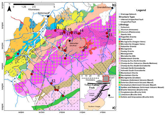 (a) Regional geological setting of the Vosges Mountains modified from Tabaud et al. (2015) [12] and (b) geological map of the northern Vosges Mountains with focus on the Champ du Feu area, NE France (modified from Bureau de Recherches Géologiques et Minières (BRGM) InfoTerre [4]). Projected coordinate system used: WGS 1984 UTM Zone 32N. Stream sediment sample numbers are indicated as 1–20.