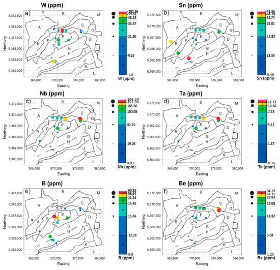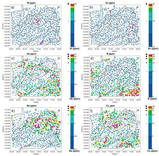 Graduated point symbol maps for (a) W, (b) Sn, (c) Nb, (d) B, (e) Be, (f) Cu using the 30th, 60th, 80th, 90th, 95th, 98th and 99th percentile distribution from Table 1. Principal geological domains are highlighted. A detailed geological map is shown in Figure 1. A, mafic and intermediate volcanic rocks of the Schirmeck Massif; B, metasedimentary rocks of the Bruche Unit; C, Waldersbach Granite; D, Kagenfels Granite; E, Natzwiller Granite; F, Fouday Granite; G, Champ du Feu granite suite; H, Bande médiane mafic volcanics; I, Neuntelstein Diorite; J, Hohwald granite suite; K, Steige schists; L, Ville schists; M, Lower Buntsandstein.