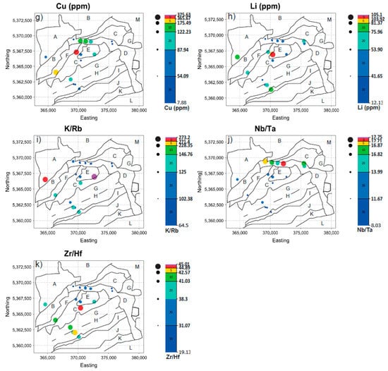 Graduated point symbol maps for (a) W, (b) Sn, (c) Nb, (d) Ta, (e) B, (f) Be, using the 30th, 60th, 80th, 90th, 95th, 98th and 99th percentile distribution from Table 1. Principal geological domains are highlighted in panel (a). A, mafic and intermediate volcanic rocks of the Schirmeck Massif; B, metasedimentary rocks of the Bruche Unit; C, Waldersbach Granite; D, Kagenfels Granite; E, Natzwiller Granite; F, Fouday Granite; G, Champ du Feu granite suite; H, Bande médiane mafic volcanics; I, Neuntelstein Diorite; J, Hohwald granite suite; K, Steige schists; L, Ville schists; M, Lower Buntsandstein. Graduated point symbol maps for (g) Cu, (h) Li, (i) K/Rb, (j) Nb/Ta and (k) Zr/Hf.