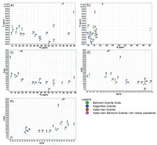 Binary plots of stream sediment geochemistry represented by broad lithological units in the drainage basin. (a) Ti vs. Th, (b) Ti vs. B, (c) K/Rb vs. Th, (d) Nb/Ta, and (e) Zr/Hf. Sample identification numbers are plotted in the graphs. Each population displays a characteristic clustering trace element assemblage. The stream sediment samples obtained downstream of the Belmont Granite suite generally has a less fractionated nature than the Natzwiller and Kagenfels Granites expressed in comparatively higher K/Rb and Zr/Hf ratios and lower Th concentrations. Decreasing fractionation indices (K/Rb, Nb/Ta and Zr/Hf) indicate an increasing influence of magmatic–hydrothermal interactions during fractional crystallization [27]. Stream sediment sample numbers are indicated as 1–20.