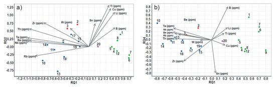 A principal component analysis (PCA) of the geochemical dataset was carried out using a log10 transformation (to eliminate the closure effect) of B, Be, Cu, Li, Nb, Rb, Sn, Ta, Th, Ti, W and Zr input variables (Table 3, Figure 5). The PCA revealed that PC1 to PC4 represent 85.68% of the total variance of the dataset, whereas the remaining eight PCs can be attributed to random processes or noise. The eigenvector table and combined variable-sample analysis (RQ) plots, in which samples plot as points and variables as vectors with the length of the vectors proportional to the variability of the two displayed principal components, outline two major correlations and elemental trends. Firstly, previously classified Kagenfels and Natzwiller Granites are principally characterised by negative RQ1 loadings, whereas Natzwiller Granite can be distinguished from Kagenfels Granite by positive RQ2 and RQ4 loadings. On the other hand, there is a noteworthy variability of the Kagenfels Granite samples 10–11, 13–14 and 18, expressed by generally negative RQ2 and RQ4 loadings of Rb and Zr, respectively. In the K/Rb vs. Zr/Hf plot (Figure 4e), these samples represent the most fractionated population with K/Rb < 120 and Zr/Hf < 32. Therefore, the PCA trends are distinctive for the previously outlined fractionated lithogeochemical populations and characterised by a Ta-Nb-Be-Rb-Th-W and Zr geochemical association. In particular, whilst PC1 broadly characterises fractionated lithologies of the Kagenfels and Natzwiller Granites in the study area, PC2 and PC4 allow the determination of local variation of fractionation in the Kagenfels Granite. In contrast, the Belmont Granite Suite and the Natzwiller/Belmont Granite with visible cassiterite (sample 20) show fundamentally different trends with positive RQ1 loadings, and a Cu-Ti and Li geochemical association. Distinctive negative and positive variability in RQ2 and RQ4, respectively, allow the determination of potential sub-populations, such as samples 6 (Hohwald Granodiorite) and 7 (Neuntelstein Diorite), which are generally less evolved and have intruded approximately 10 Ma earlier than the Belmont Suite [6]. In summary, the analysis of petrogenetic indicator elements in bivariate plots along with principal component analysis provide a robust tool to determine different litho-geochemical populations and element associations in the study area.