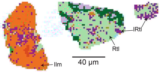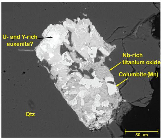 Other samples obtained and analysed from the Kagenfels Granite (Appendix A) show similar modal mineralogical compositions compared to stream sediment samples 17 and 18 and therefore provide evidence for peraluminous two-mica monzogranite. In particular, stream sediment samples 14–16, 19 and 20 are characterised by the presence of muscovite (0.80–1.97%), biotite (1.26–2.01%), tourmaline (0.51–1.43%), chlorite (1.47–3.52%), ilmenite (0.28–0.98%), ilmenorutile (0.01–0.05%), zircon (0.54–3.1%), monazite (0.01–0.4%), cassiterite (0.01% in sample 16) and columbite (0.01%). Ilmenorutile is commonly intergrown with rutile and ilmenite (Figure 7) and columbite can be found as inclusions in cassiterite (Figure 8). Further follow-up by SEM confirmed the presence of various Nb-rich phases (Mn-columbite, U-rich euxenite-(Y), and Nb-rich titanium oxide/ ilmenorutile) in sample 17 (Figure 9), which, together with a high geochemical Nb/Ta ratio of 14, implies that Nb-rich mineral phases are distinctively more abundant than Ta phases in the western part of the Kagenfels Granite. Sample 18 (Figure 10) shows that chlorite is associated with tourmaline and muscovite and therefore represents evidence for granite-related magmatic–hydrothermal alteration [38]. However, due to the size of the fragments and the absence of quartz, it is not entirely conclusive whether this mineral association is related to veins or wall-rock alteration.