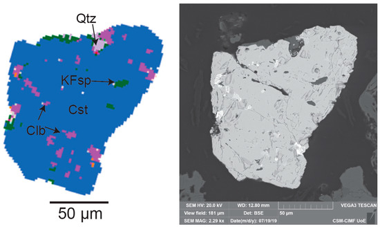 QEMSCAN® and SEM mineral map of a stream sediment particle (sample 16) showing the intergrowth of cassiterite (cst)–columbite (clb)–K–Feldspar (KFsp) and quartz (qtz).