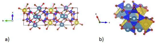 Agrellite crystallized in triclinic, space group P(−1), and unit cell parameters are: a = 7.759 (2) Å, b = 18.946 (3) Å, c = 6.986 (1) Å, α= 89.88°, β= 116.65°, γ= 94.34°, Z = 4 [7]. All atoms in the agrellite lattice are present in general positions and the Wyckoff site of all atoms is denoted as 2i. The crystal structure of agrellite consists of two different NaO8 distorted cubes polyhedra, two CaO5F octahedra (hereinafter referred to as Ca1B and Ca2A), and two CaO6F2 polyhedra (named as Ca1A and Ca2B) coupled with two different Si8O20 chains [7]. The mean of Ca–O and Ca–F distances are smaller for CaO5F octahedra and equal for Ca1B and Ca2A, respectively 2.381 Å, 2.192 Å, 2.367 Å, and 2.201 Å than CaO6F2 and equal for Ca1A and Ca2B, respectively 2.574, 2.402, 2.615 Å and 2.454 Å (Figure 1a,b).