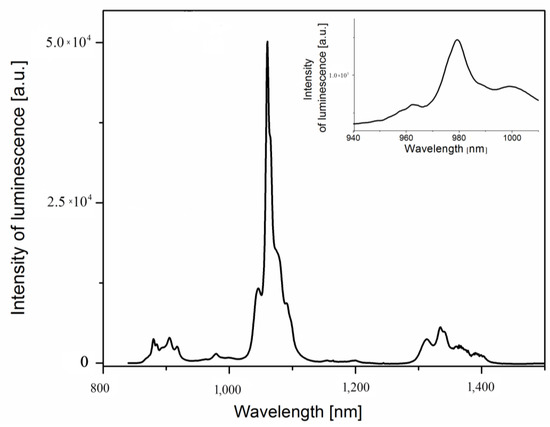 The emission of Nd3+ was measured as a group of three multiples (Figure 3). The most intense was measured at 1046, 1060, 1064, 1078, and 1092 nm and corresponds to the 4F3/2 → 4I11/2 transition. Another group of lines at 879, 885, 893, 905, and 917 nm is associated with the 4F3/2 → 4I9/2, transitions and the last with lines at 1313, 1335, and 1340 nm-with the 4F3/2 → 4I13/2 transitions. The emission spectrum of Yb3+ was not very intense (inset of Figure 3) and band 979 nm corresponds to the transition 2F5/2 → 2F7/2.