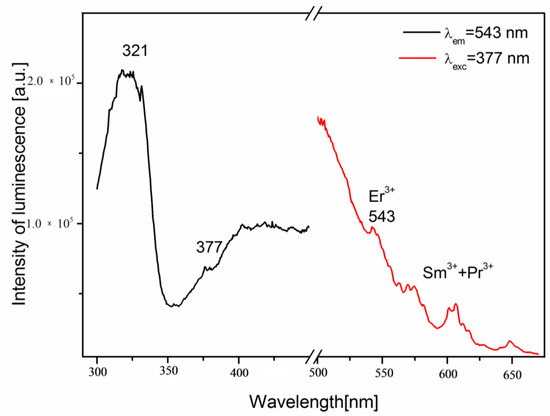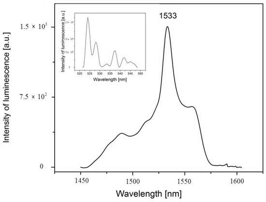 It was expected that the measurement of distinct emission lines of Er3+ would be possible due to the significant content of this ion and its high luminescence efficiency. However, the emission bands of Er3+ corresponding to the 2H11/2 → 4I15/2, 4S3/2 → 4I15/2 and 4F9/2 → 4I15/2 transitions and usually measured at a 500–600 nm range were not clearly visible for steady-state luminescence measurements using a xenon lamp excitation, contrary to time-resolved measurements [8]. It has previously been verified [9] that for steady-time measurements using a xenon lamp, the most convenient excitation for Er3+ is λ = 377 nm. However, for the studied agrellite specimen, only a weak emission band at 543 nm was measured (Figure 4). In the NIR range, the distinct emission band at 1533 nm (1554 nm, 1512 nm, and 1488 nm) was measured as a result of the 4I13/2 → 4I15/2 transition (Figure 5). Using laser excitation, emission bands of 2H11/2 → 4I15/2, 4S3/2 → 4I15/2, and 4F9/2 → 4I15/2 transitions were also obtained (inset in Figure 5). However, the intensities of these bands at 520 and 550 nm were very weak, not only in comparison with the Er3+ emission in the NIR range but also with the Sm3+ and Pr3+ emission lines, although the samarium or praseodymium concentration was not much higher than the Er content (Figure 6).