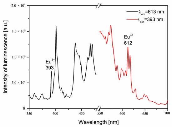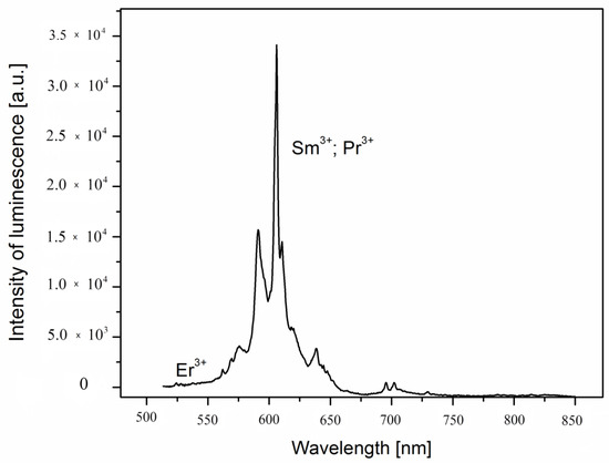 No emission of Eu2+ was found. The emission of Eu3+ as a characteristic line at 613 nm was obtained for the most convenient excitation λexc = 393 nm (Figure 12). However, this excitation also caused Sm3+ and Pr3+ emission.