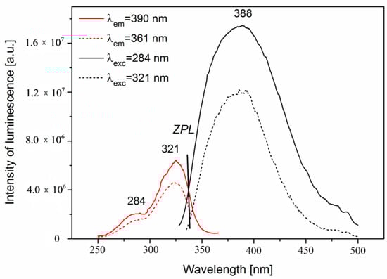 The cerium content in the studied agrellite sample was high. Electric-dipole 4f–5d transitions are even and spin allowed with the oscillator strength at half-width and short luminescence decay time. Cerium Ce3+ is often added to synthetic crystals because of its well-known properties as an efficient sensitizer of luminescence. Luminescent materials doped with Ce3+ can efficiently absorb excitation energy. A very intensive emission band at 388 nm has been measured (Figure 7). The zero phonon line (ZPL) position was designated in the point of spectral overlap of the excitation and emission curves, i.e., at λ = 337 nm (29,673 cm−1). The Stokes shift ∆S, as the energy difference between absorption/excitation and emission maxima of transition between the lowest 5d and the 4f ground states, is equal to 1567 cm−1. This value is not very high, probably owing to the high coordination number around Ce3+ and the long Ca–O distance [10,11]. For the lowest Raman frequency of agrellite 331 cm−1, the Huang-Rhys parameter S is equal to S = 2.8, so electron-phonon coupling may be recognized as intermediate.